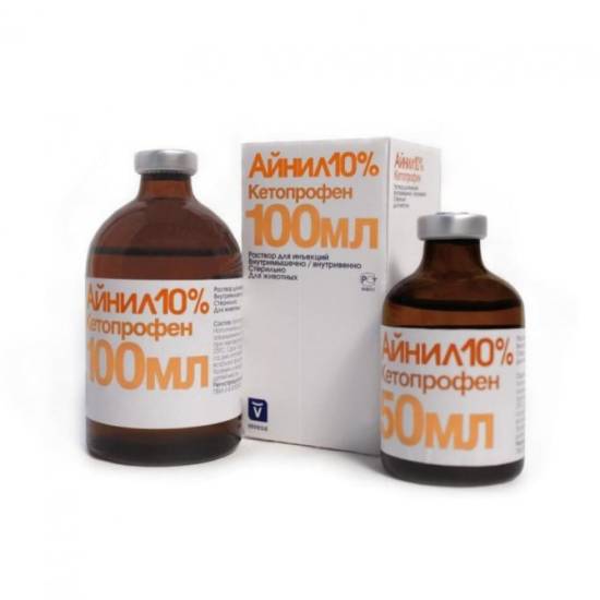 Специализированное ветеринарное средство для инъекций на основе кетопрофена – в 1 мл 10 мг действующего вещества. Айнил оказывает анальгезирующий эффект, сбивает температуру и снимает воспаление. Дополнительно предотвращает тромбообразование. Стоит 1 600 р.